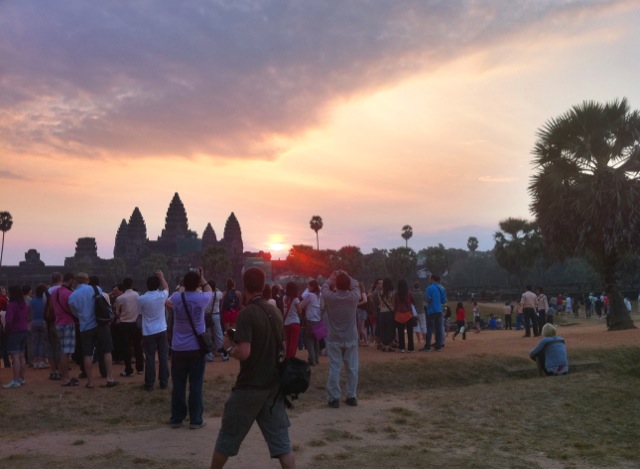 The sunrise at Angkor Wat is stunning. The majestic temple is lit from behind by a sleepy sun. The most enchanting moment occur when the reflection of the sun can be seen in the pool right in front of the temple. All this is decorated with the sound of ancient drums in order to scare the moon away. Unfortunately, those drums didn’t prevent (literally) thousands of tourists of trying to capture the moment on camera. I would guess that more than 10.000 pictures of that sunset were taken on this day alone.
