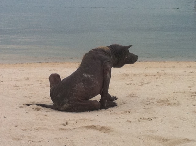 I’ve seen many a type of street dog: the ‘faithful’ that accompanies you for hours, the ‘old fighter’ which can still chew a nice leg, the ‘ambitious king-to-be’ which is always ready to fight, and the ‘ugly one’. This dog is one of the latter category. Without hair except for the top of his back (where he can’t reach with scratching), bite wounds on his nose, and a friendly smile that would melt a heart made of stone. This dog lives in ‘heaven’: right next to a $400 / night resort on an island that would be disqualified for a Bounty commercial as it is unbelievably pretty. He seemed quite happy.Home » Uncategorized » Hell in paradise